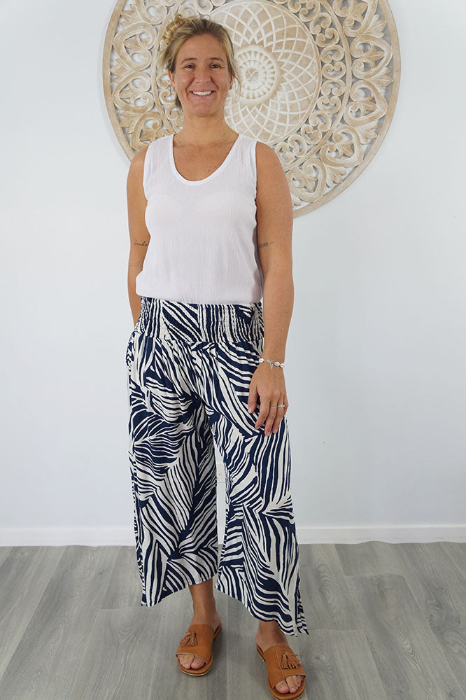 Crafted with a shirring elastic waist, wide leg, and adjustable ties, the 3/4 Bazzar pant in "Abstract Geo" print is the perfect everyday garment for sizes 10-16.