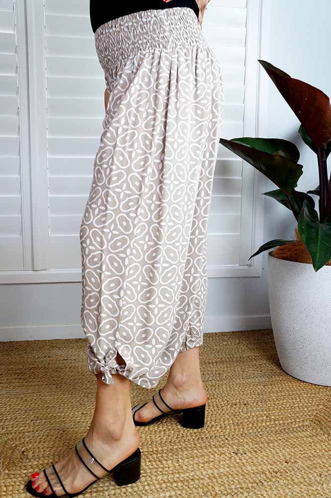 Crafted with a shirring elastic waist, wide leg, and adjustable ties, the 3/4 Bazzar pant in "Links" print is the perfect everyday garment for sizes 10-16.