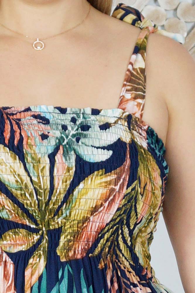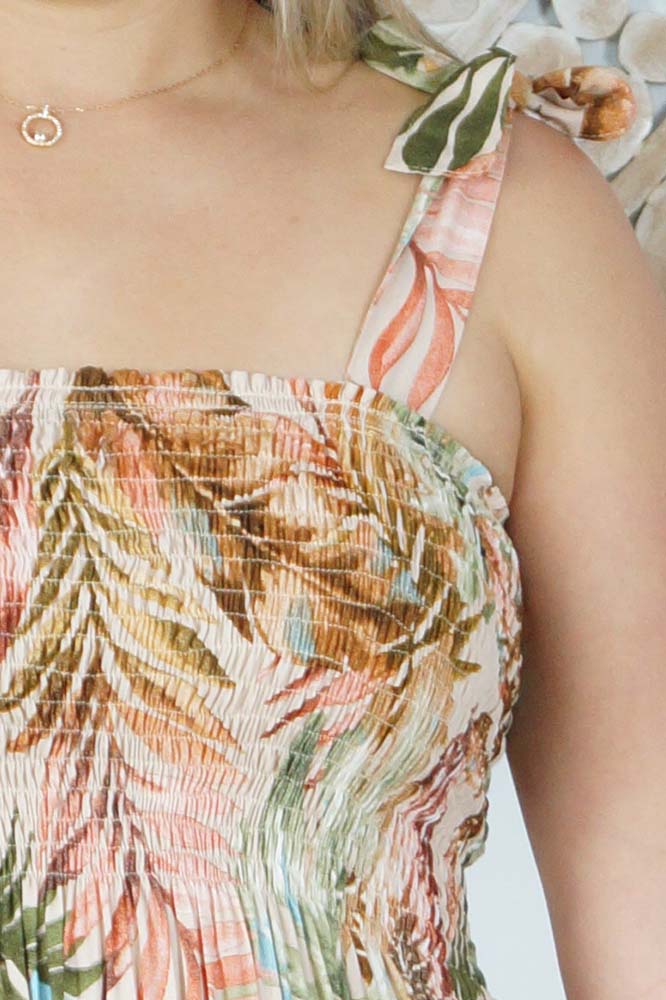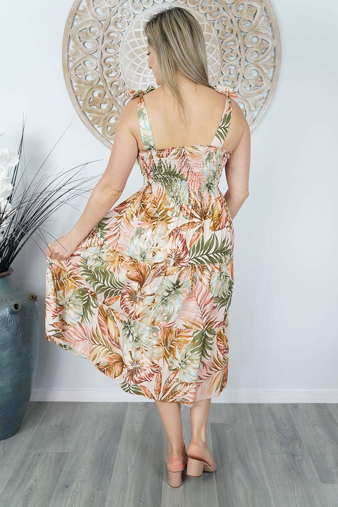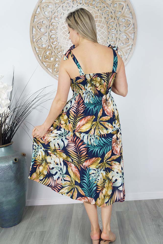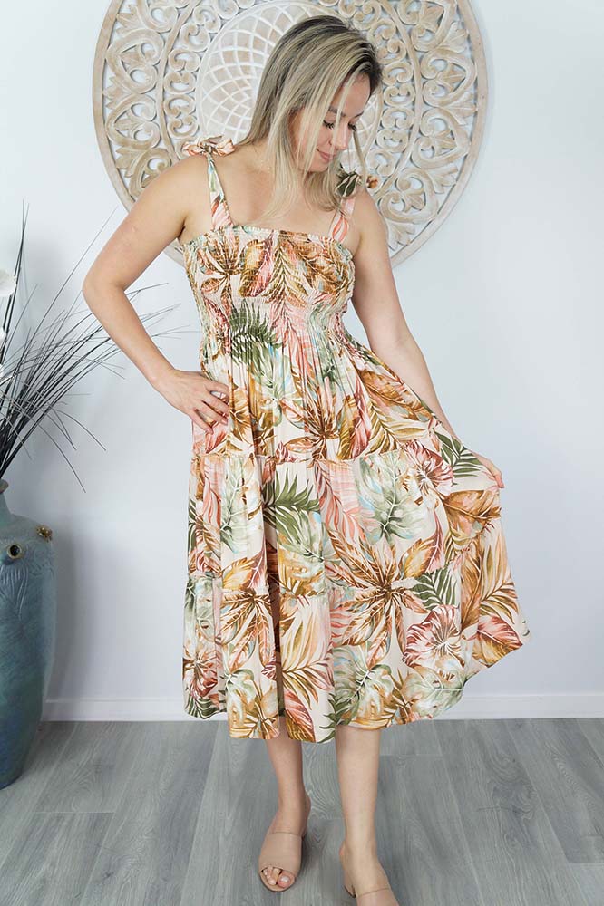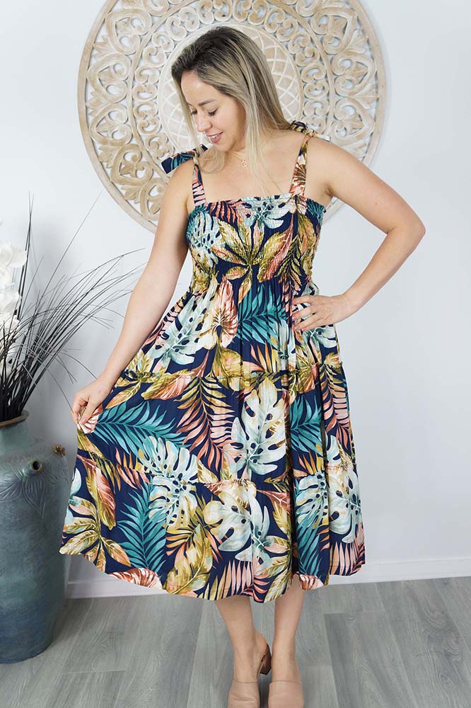 Our 3/4 Tie up smock dress features square neck, shirred bodice, tie up shoulders and a tiered skirt. Made from our soft cool rayon which is perfect for those hot days.