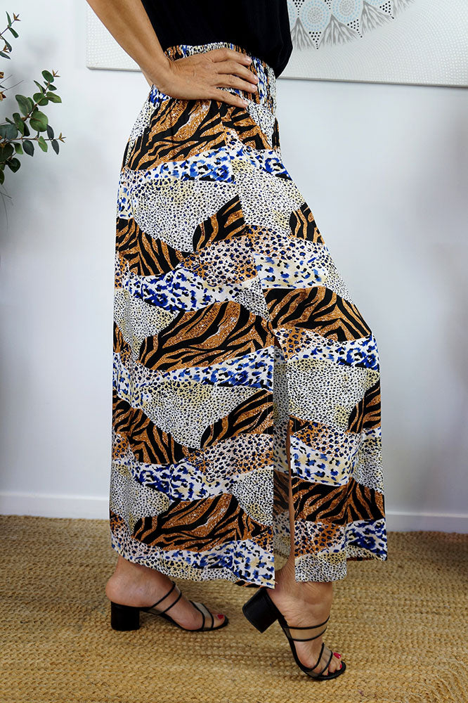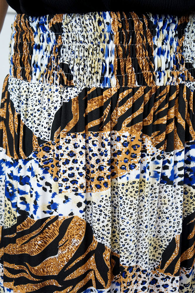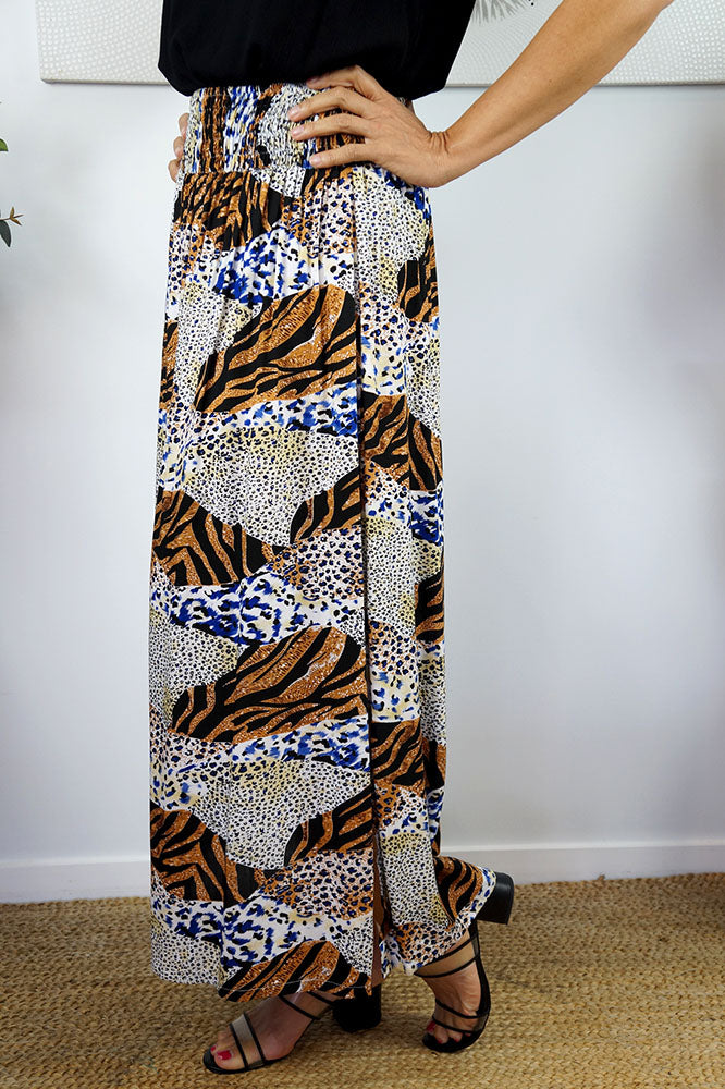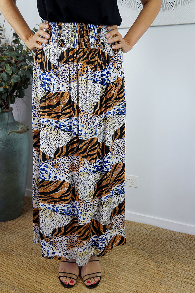 This rayon skirt features an elastic smocking waist, and splits either side. ONE SIZE TO FIT 10-16