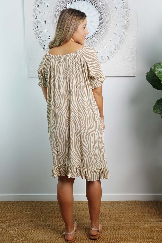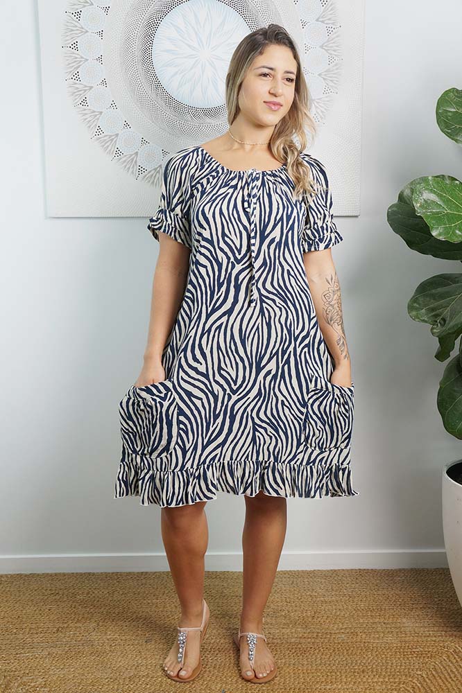 Made from crinkle rayon, the cuba dress features elastic around the back neck line with a drawstring tie at the front, frill detail on sleeves and hem line with pockets on each side. We have made this dress for comfort, sizing to fit 10-16