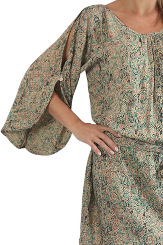 Made from a beautiful light weight rayon chiffon, with open sleeves and a matching fabric tie for around the waist this dress is perfect for summer. Available in 3 sizes to choose from.