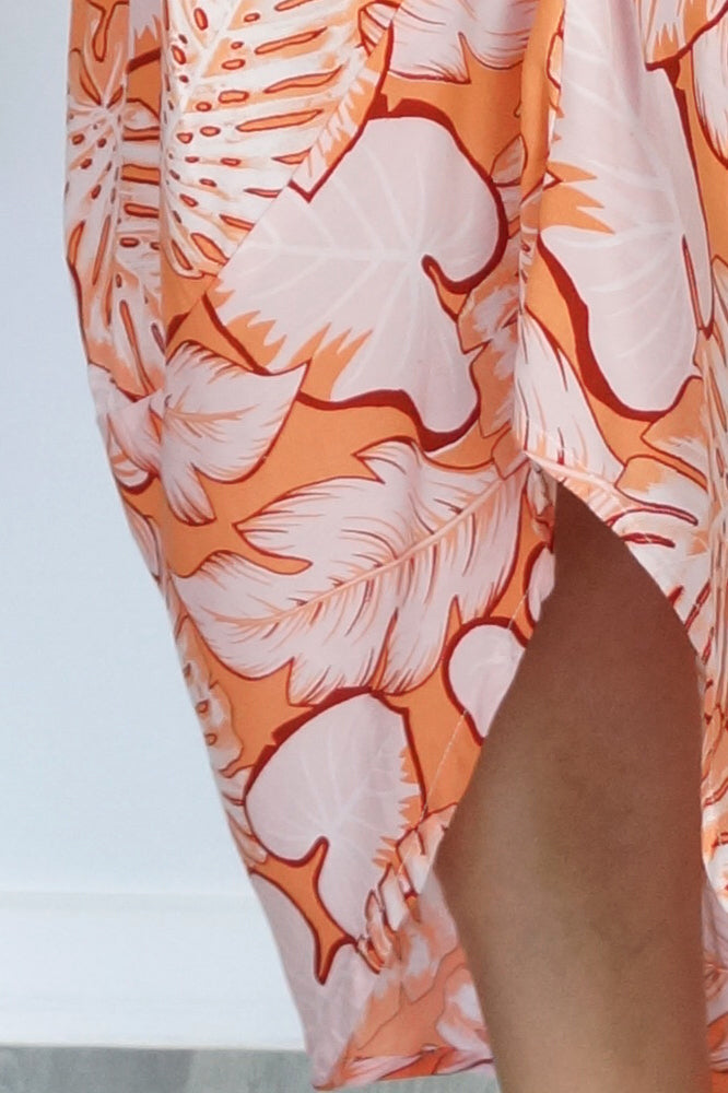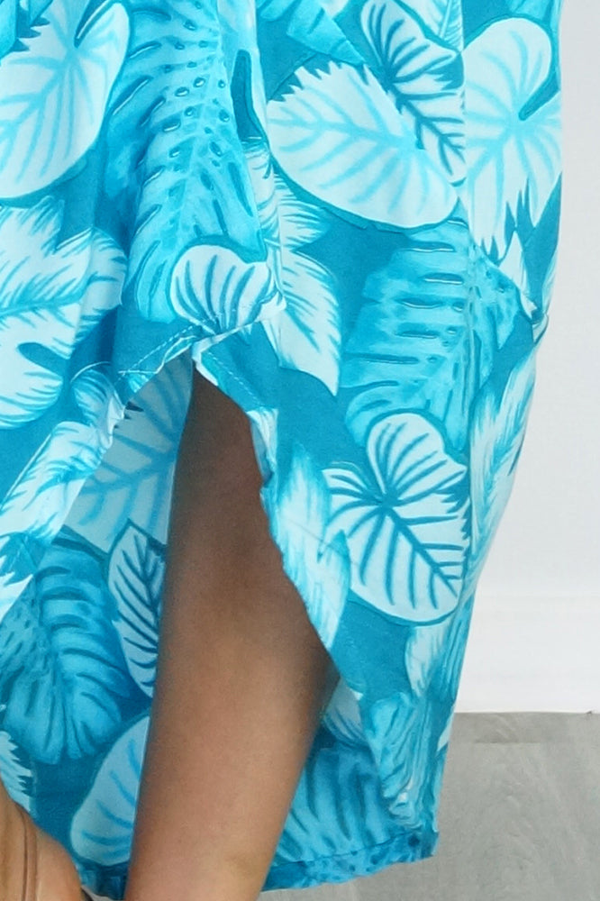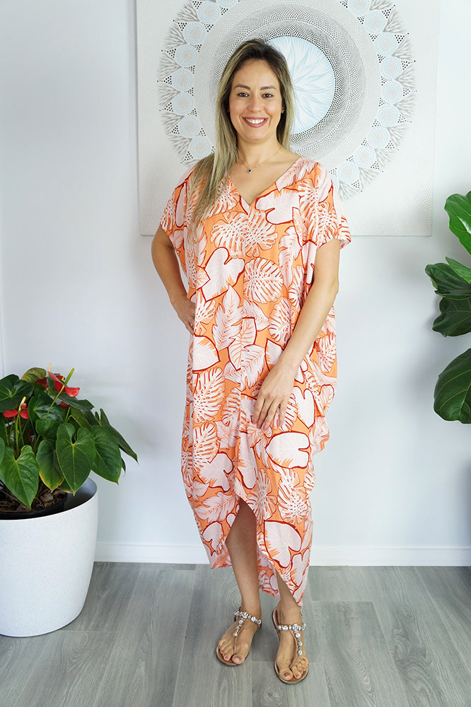 Comfortable day dress with short sleeves. Rising up in the front to a comfortable knee length. Free falling style to suit most body shapes.