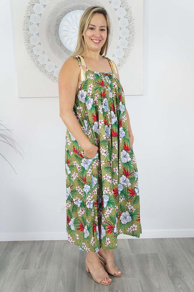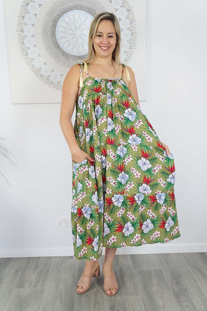 Features include 3-panel construction, elastic underarms for a snug fit for all sizes up to size 18, and side pockets. Tassles on the straps complete this beautifully made dress.
