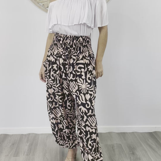 The harem pant is 100% rayon and 100% comfort, with shirring around the waist and elastic around the ankle. 3 sizes available. Free size to fit 10-16, 18-20 and 22-24.