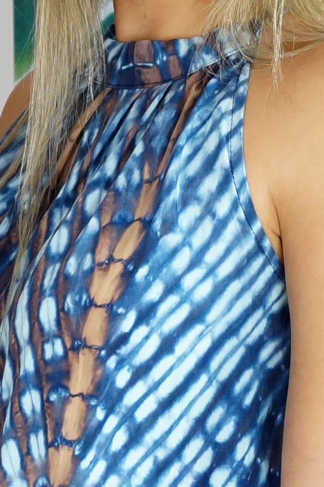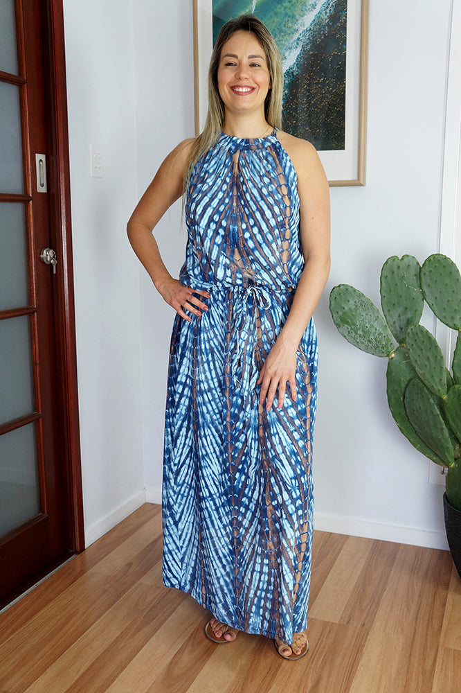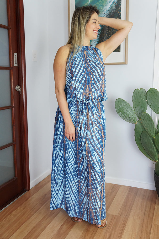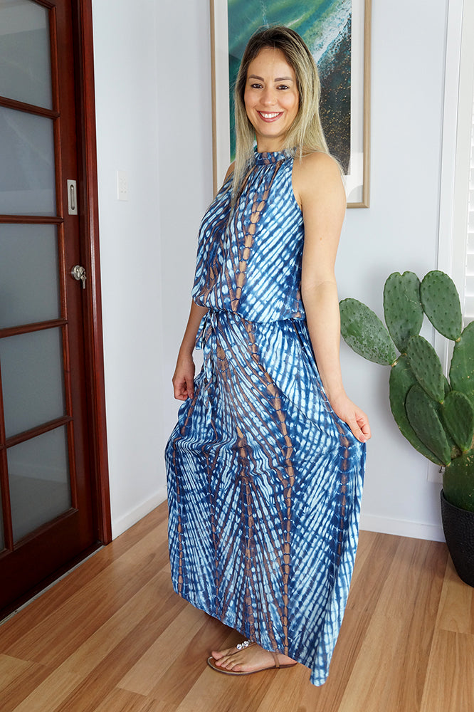 The Long Chloe Dress features a high halter neck design, elastic drawstring tie waist which allows this rayon maxi to fall beautifully on any body shape.