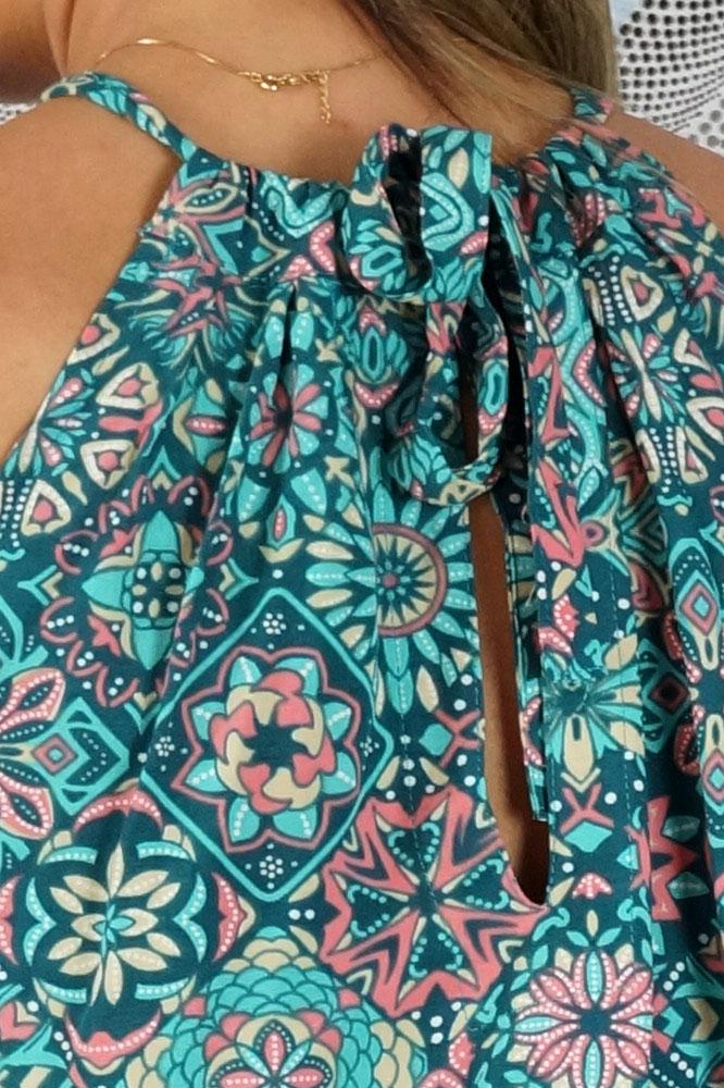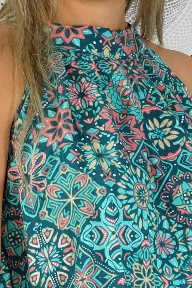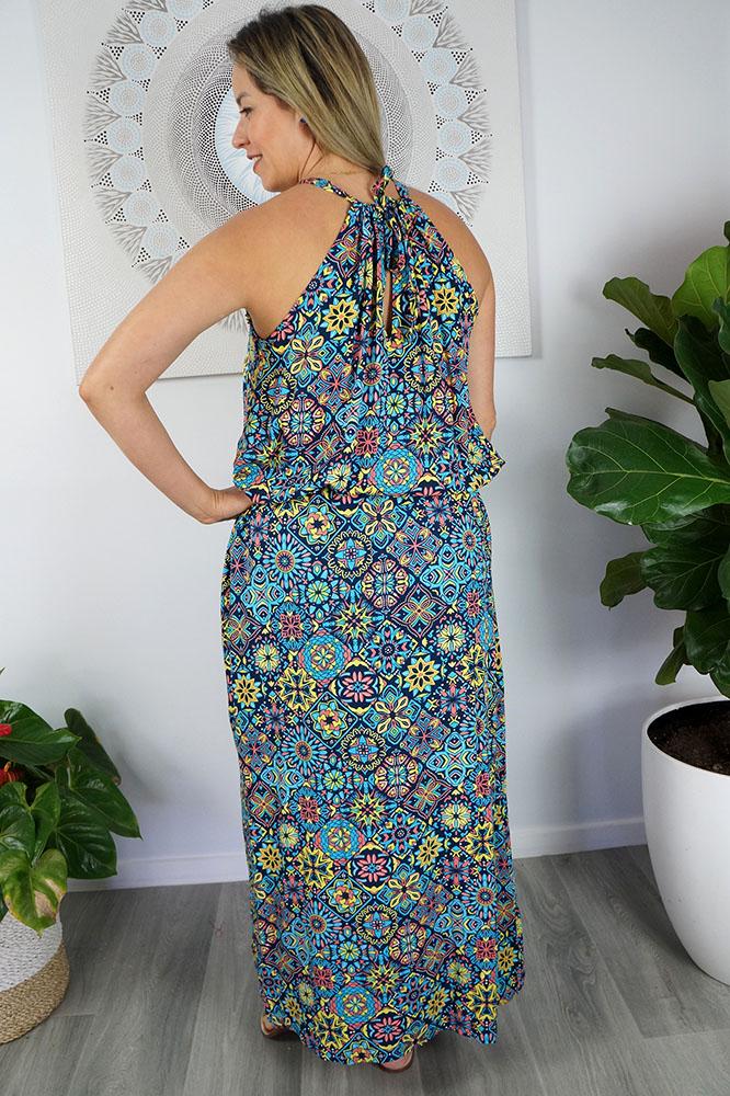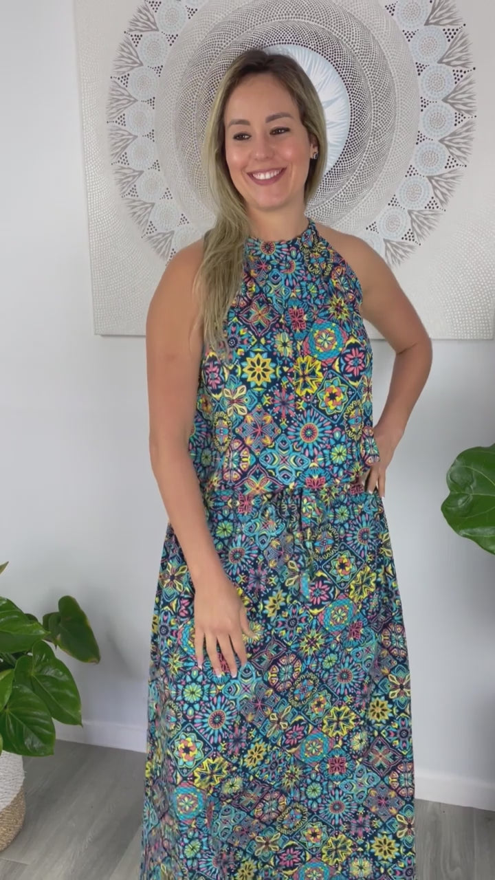 The Long Chloe Dress features a high halter neck design, elastic drawstring tie waist which allows this rayon maxi to fall beautifully on any body shape.