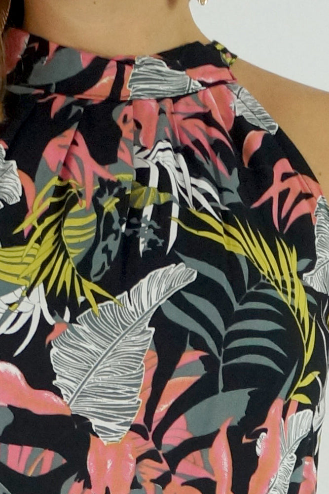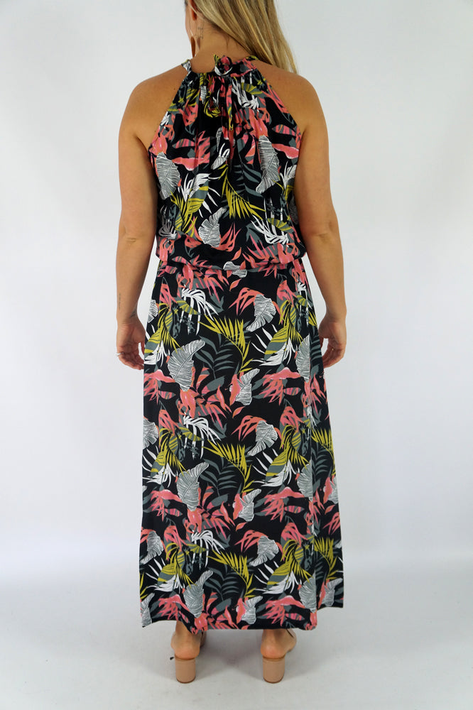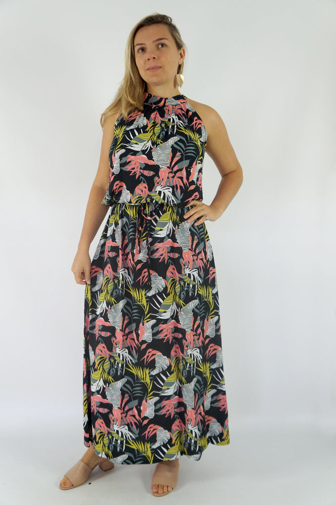 The Long Chloe Dress features a high halter neck design, elastic drawstring tie waist which allows this rayon maxi to fall beautifully on any body shape.