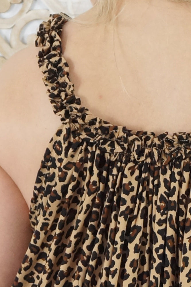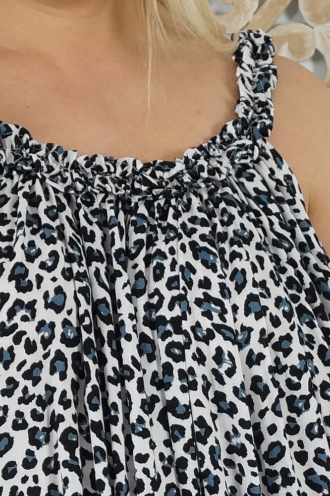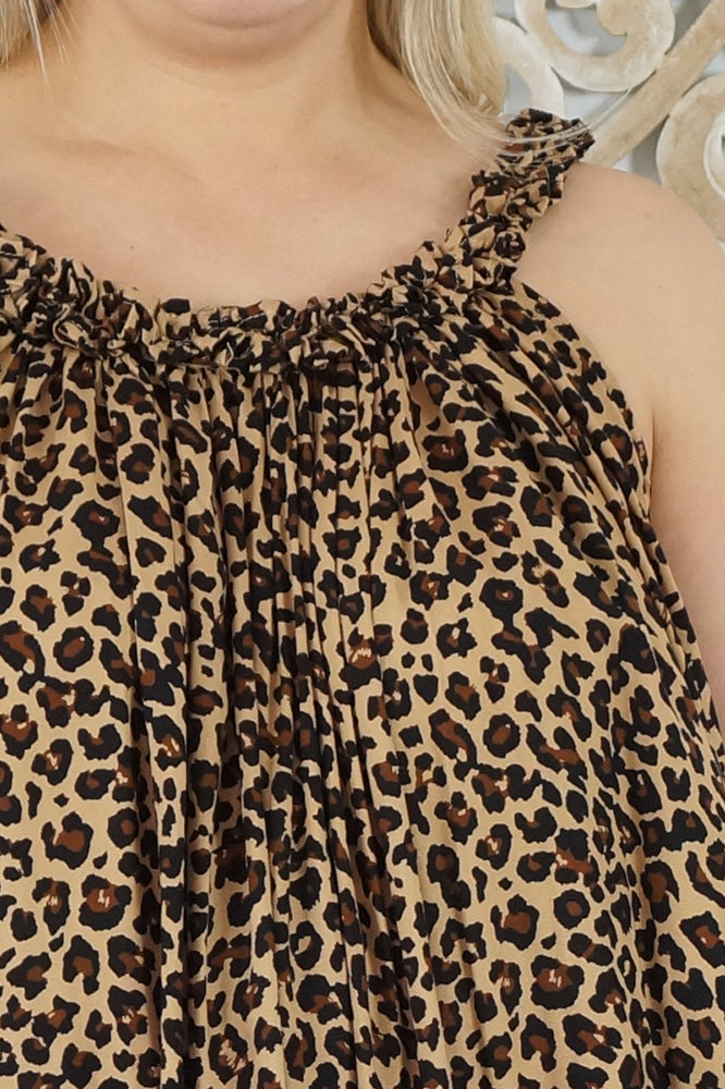 Made from a cool printed rayon, with a stylish frilled neckline.