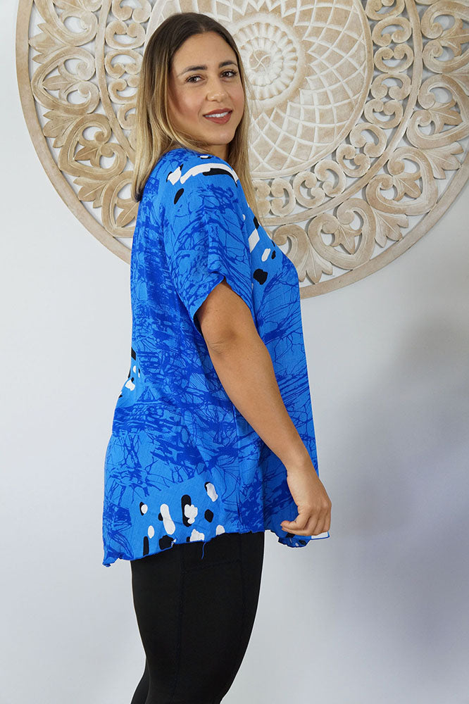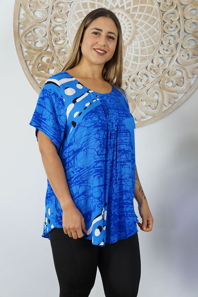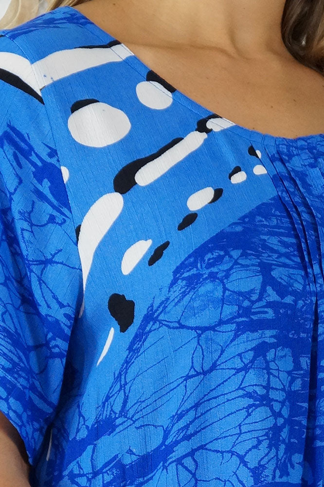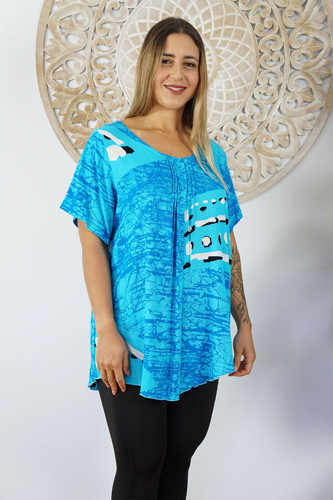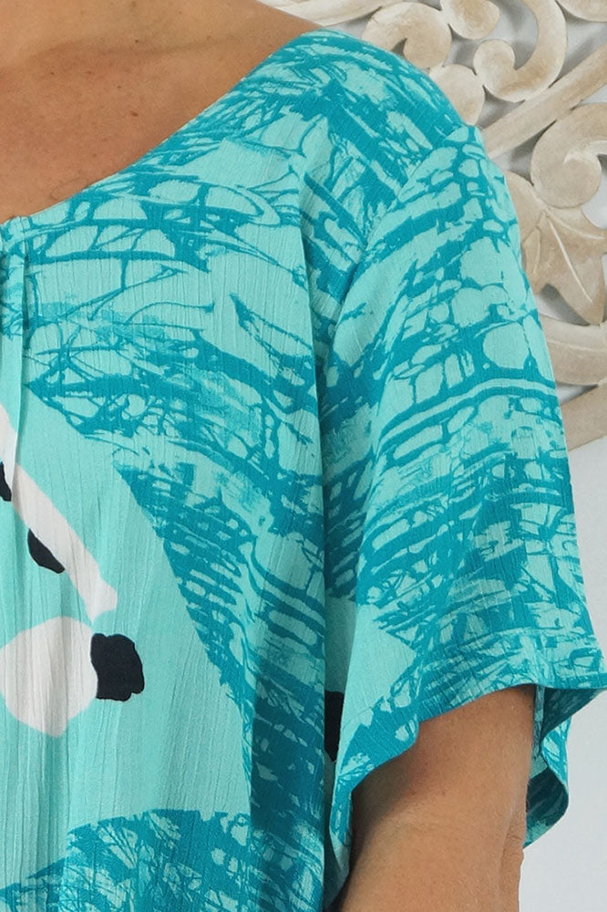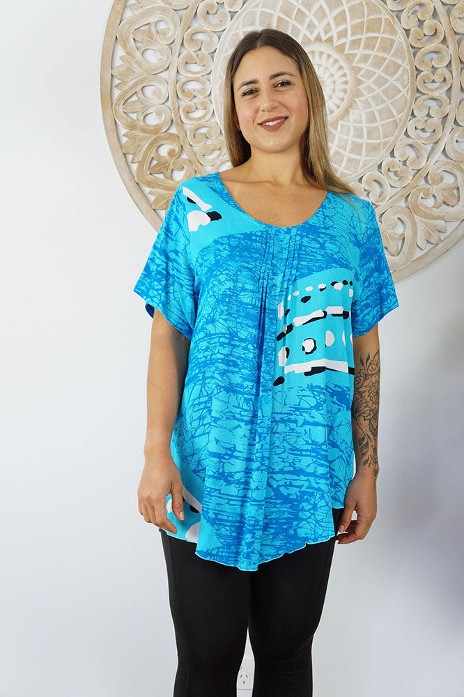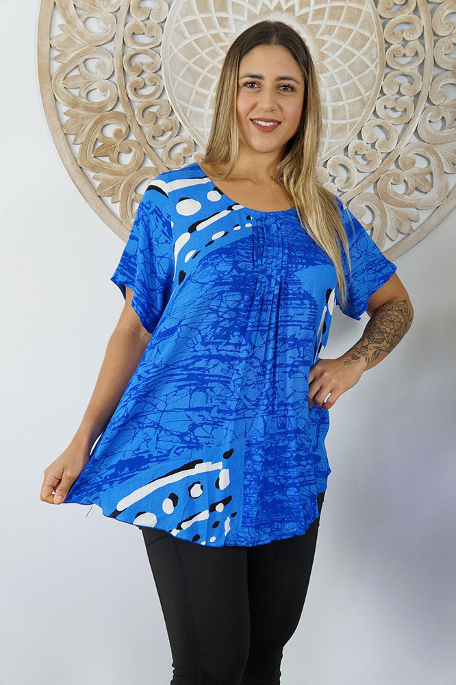 A flowy top with sleeves made from a cool crinkle rayon for those hot summer days. Sizes available 10-16, 18-22