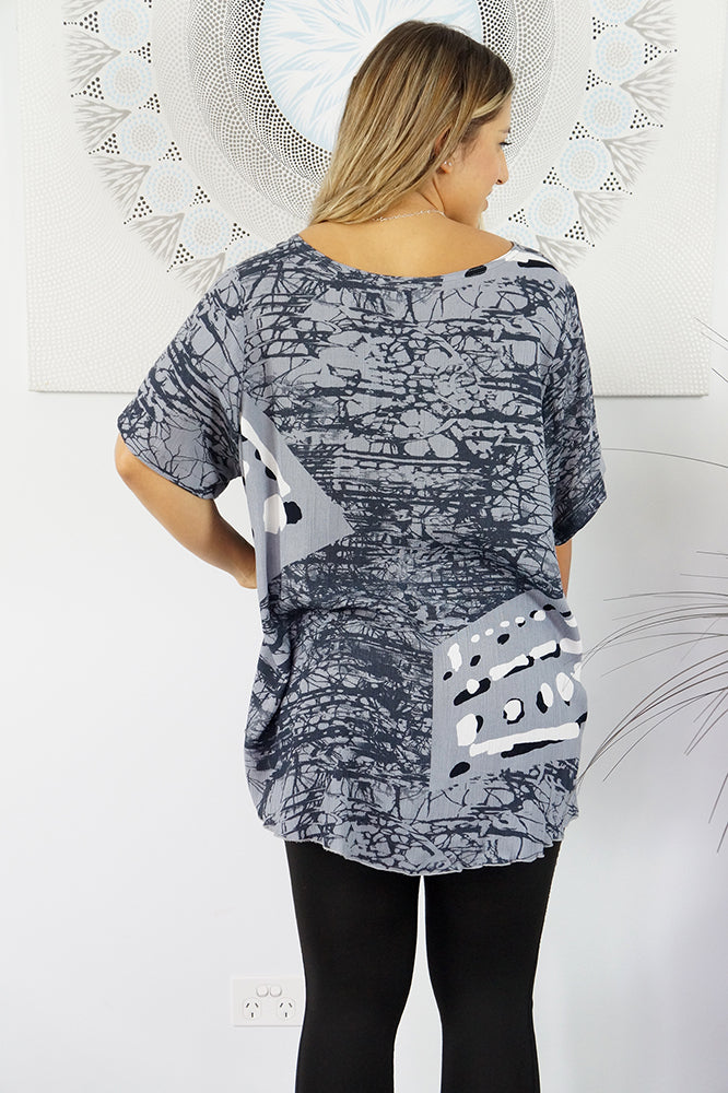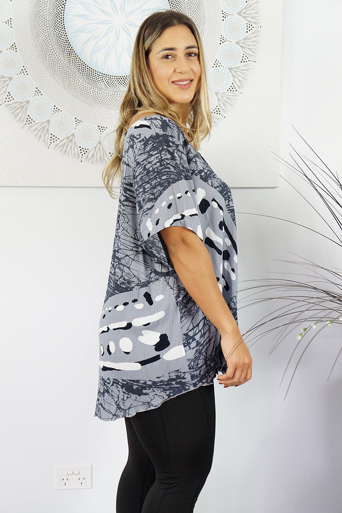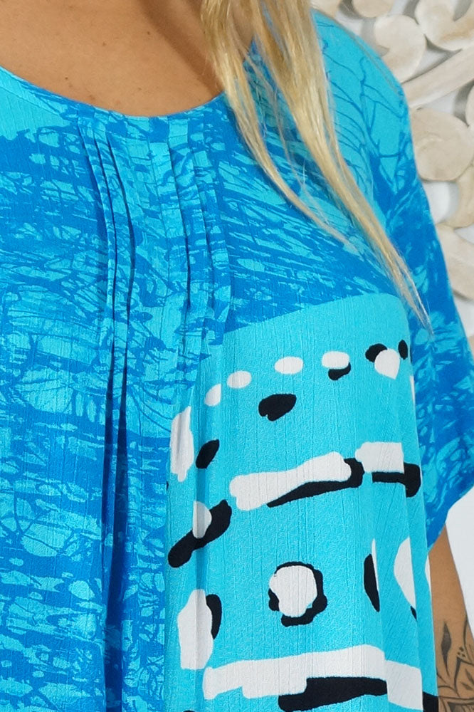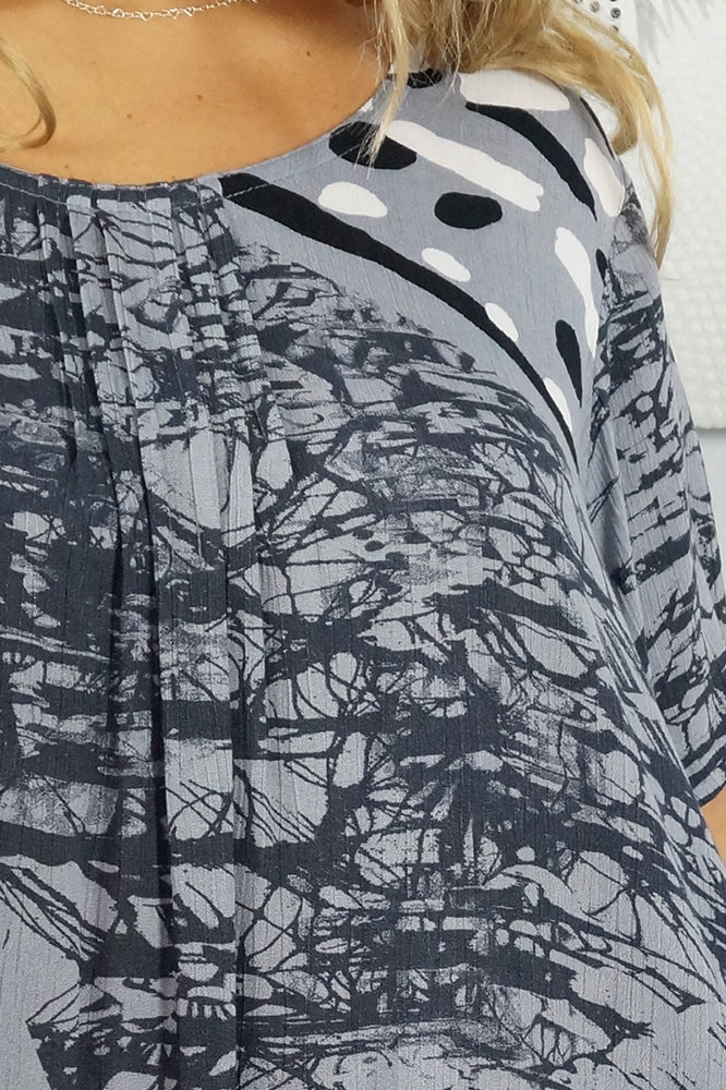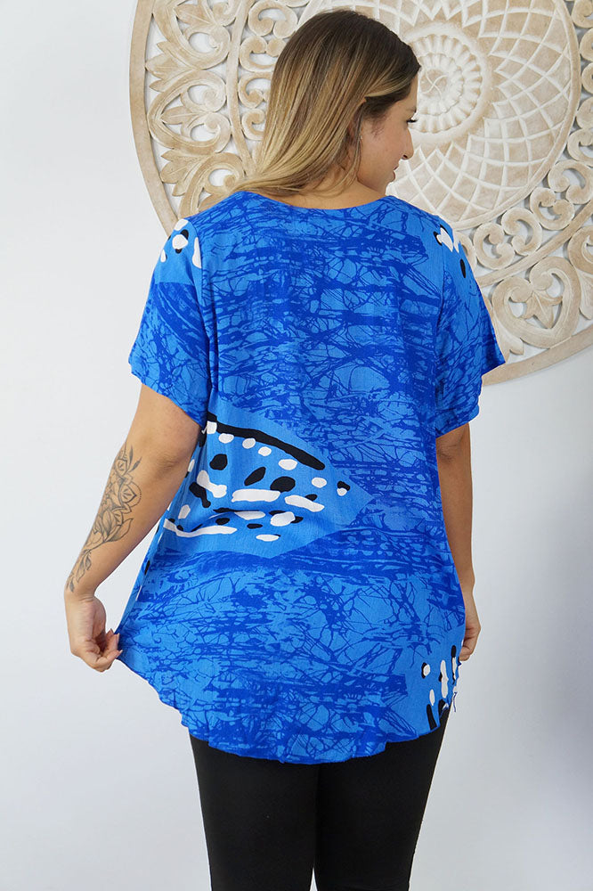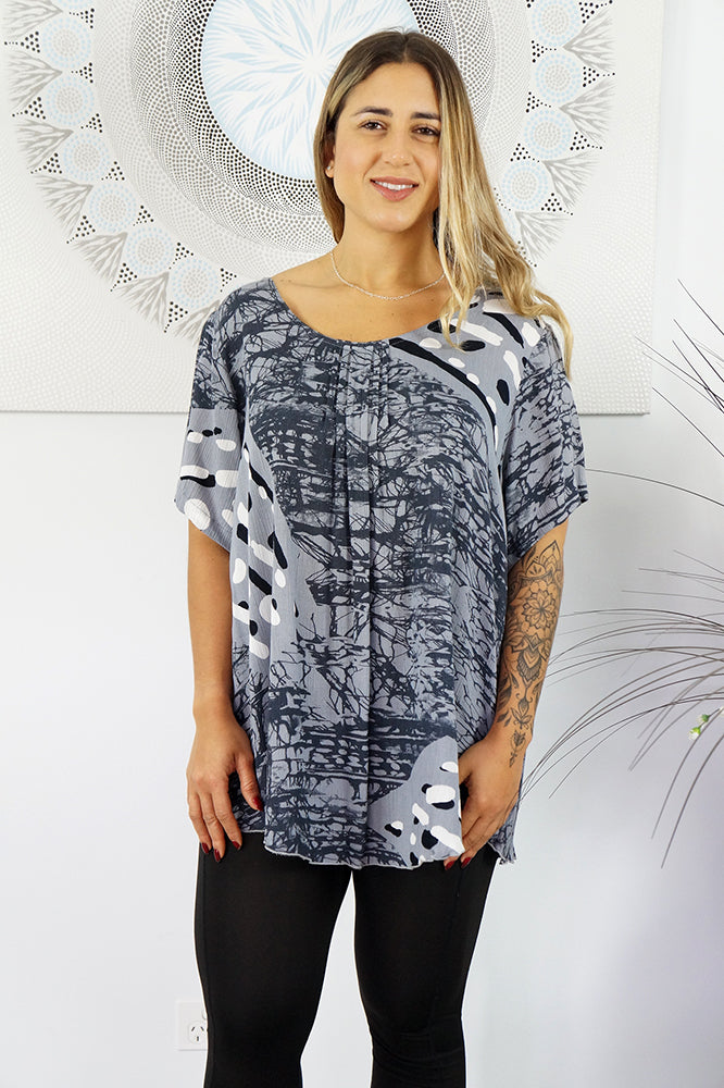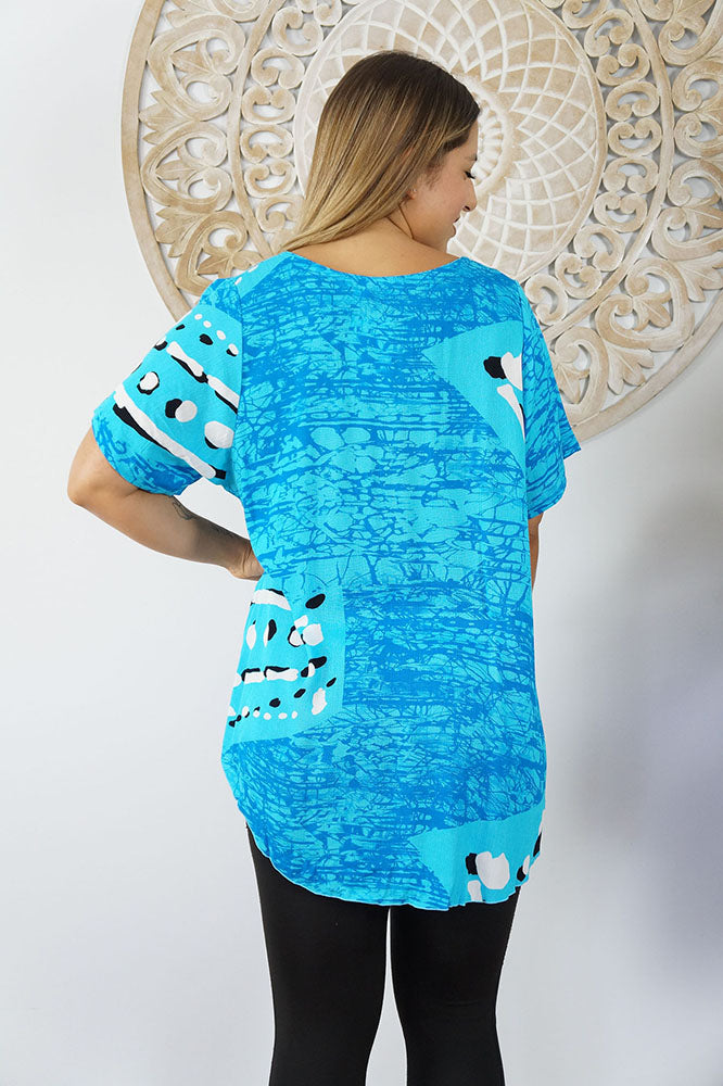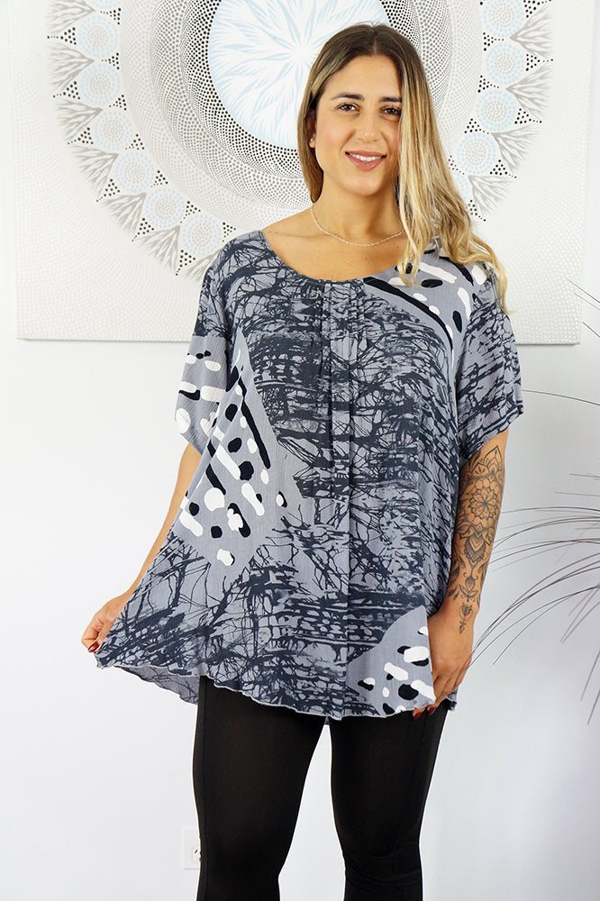A flowy top with sleeves made from a cool crinkle rayon for those hot summer days. Sizes available 10-16, 18-22