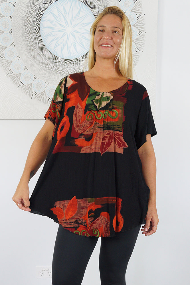 A flowy top with sleeves made from a cool crinkle rayon for those hot summer days. Sizes available 10-16, 18-22