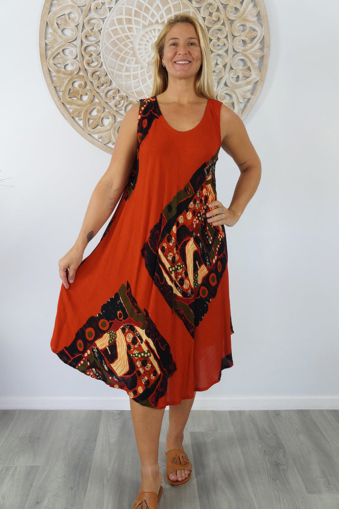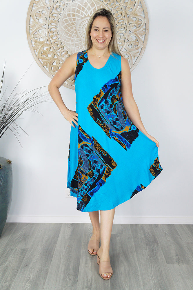 Cool and comfortable sleeveless dress in lovely pre shrunk crinkle rayon. Fabric is cut of the bias to assist the garment to fit many body shapes. Free Sizing 10 - 18.