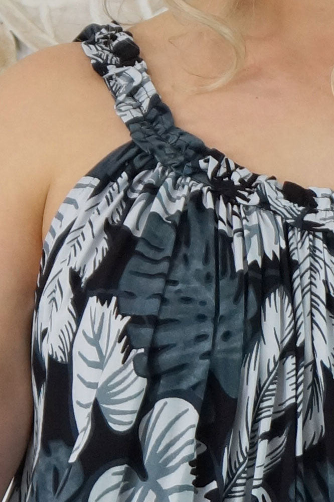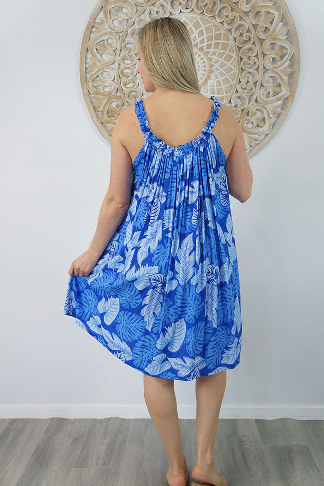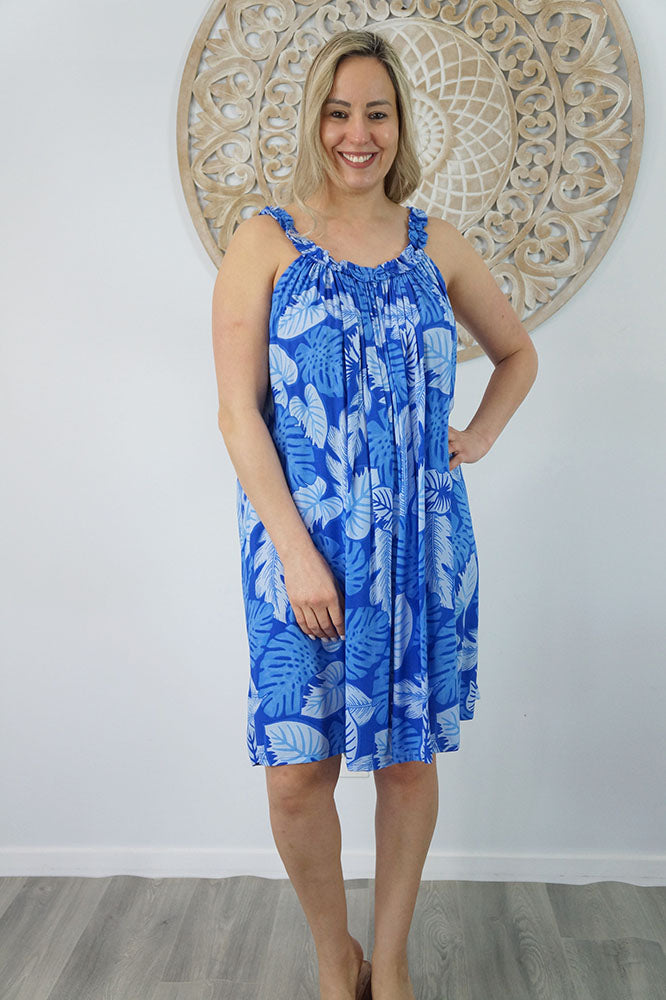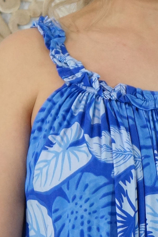 Made from a cool printed rayon, with a stylish frilled neckline.