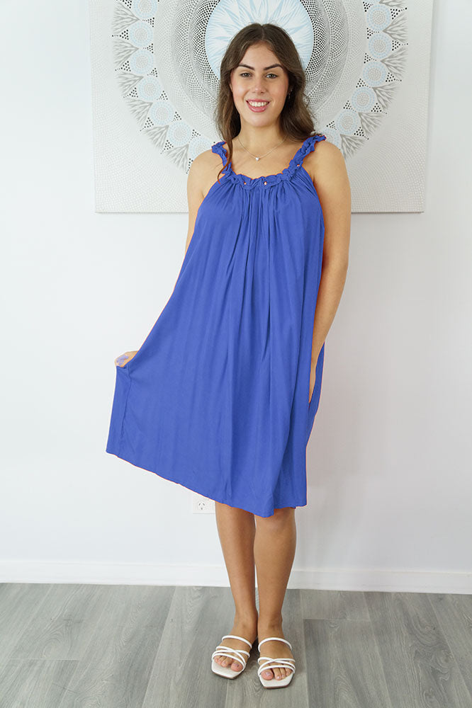 Made from a cool printed rayon, with a stylish frilled neckline.