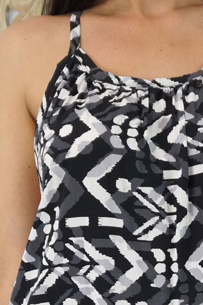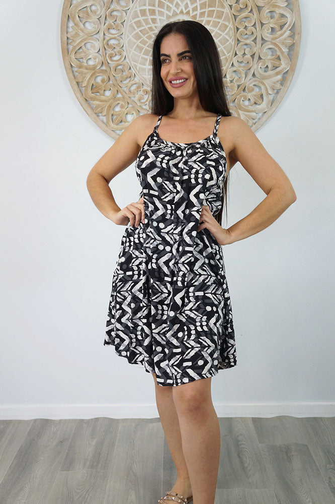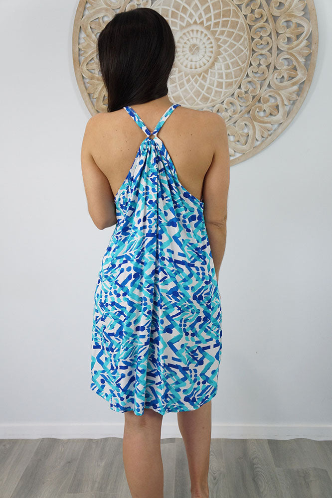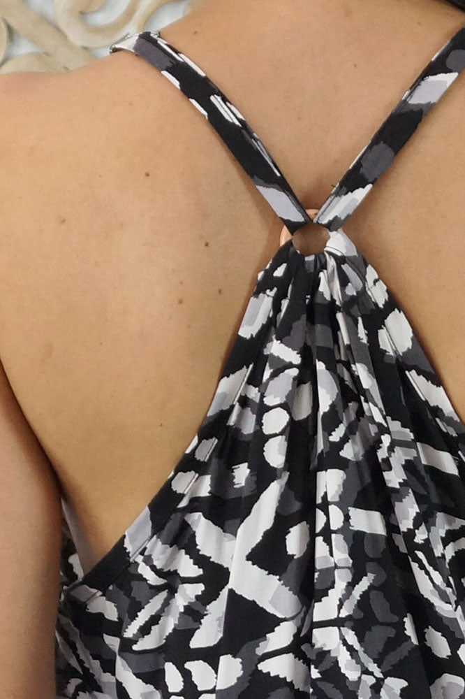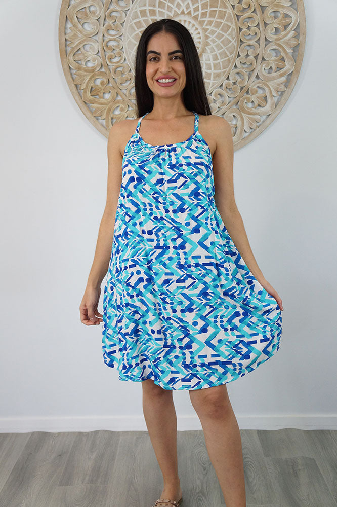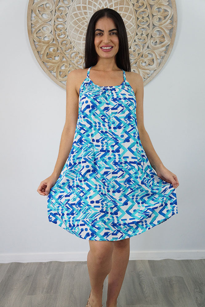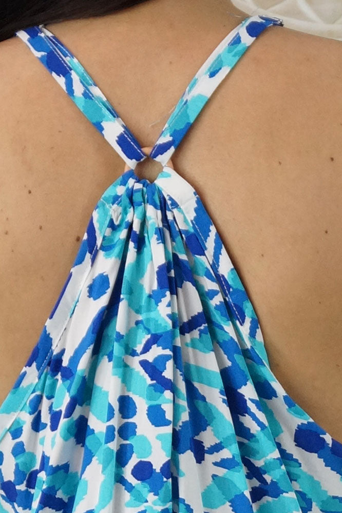 The Short Sherbet "Patchwork" dress offers a comfortable and stylish option for warm weather. Made from soft, lightweight rayon, it helps keep you cool, while its loose, flowing silhouette allows for easy movement. Featuring adjustable straps and a distinctive wooden ring at the back, it showcases a trendy racerback design with an elegant touch.