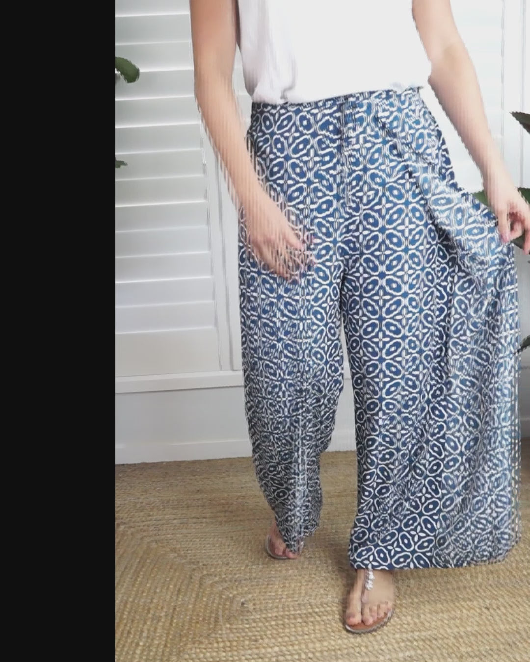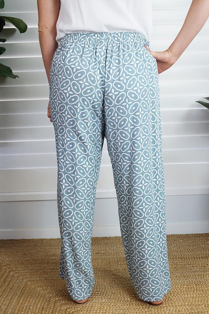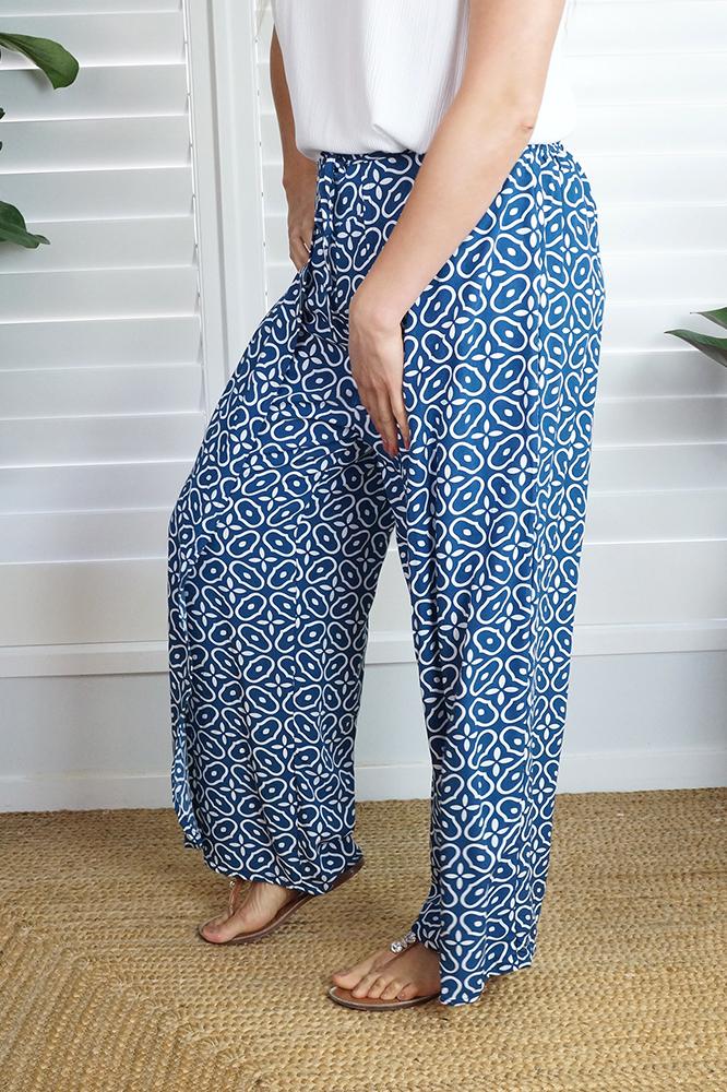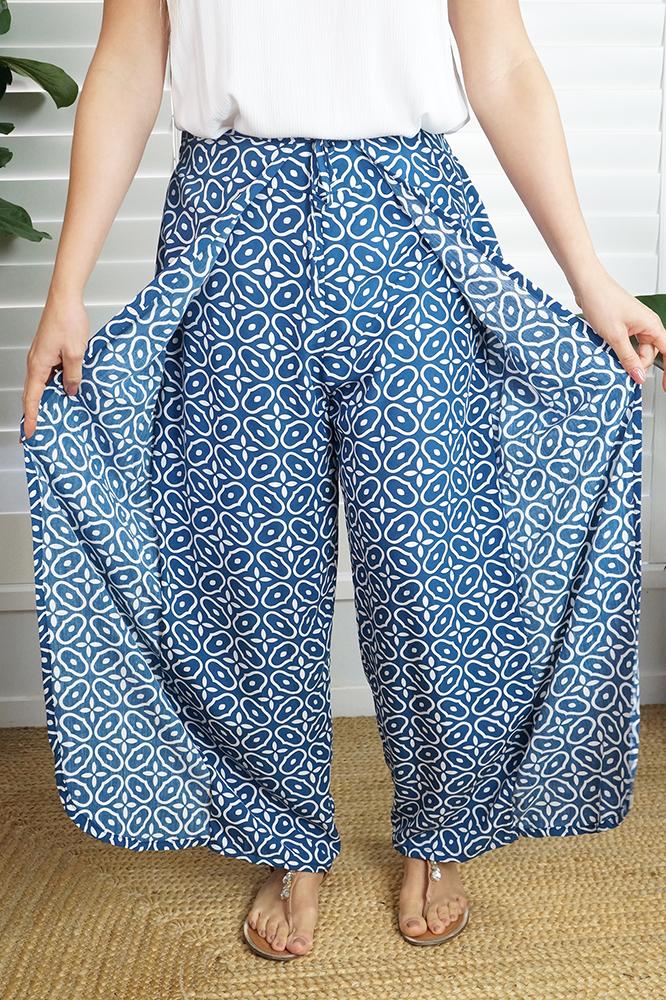 The "Links" print Wrap Around pant, made from a comfortable rayon has an elastic waist band on the back which makes a great fit. One size to fit 10 up to size 16.